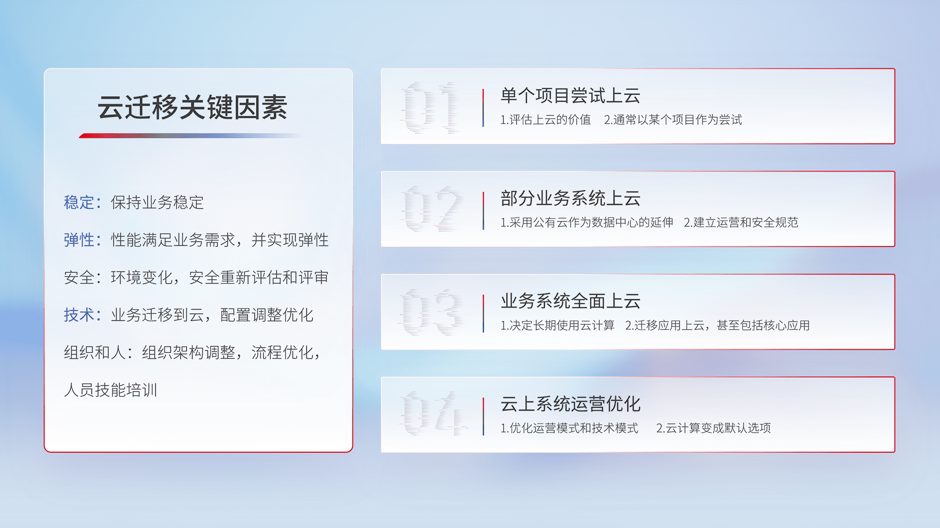 结合实际业务,,,从规划设计、、、、云平台选型、、、、云原生改造、、、数据迁移、、、、集成交付,,,,迁移全过程为客户识别最佳上云路径,,,做好风险识别管理,,,,设计网络架构、、身份权限、、、、安全审计合规、、、、操作审计、、日志审计、、、、监控告警策略、、多站点容灾设计等,,对云上基础设施进行整体规划,,提升IT治理水平,,以满足弹性、、高可用、、、、高性能的需求。。。