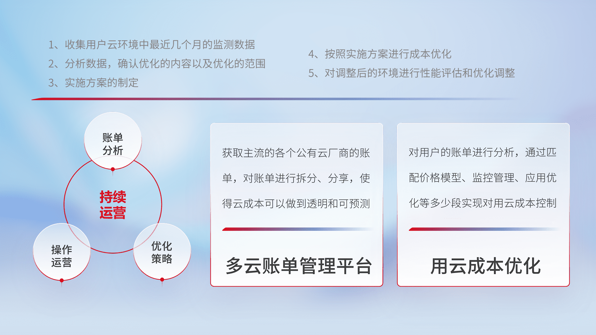 通过多云纳管,,以统一的资源数据模型把客户的云资源进行抽象和封装,,,,进而实现对多云资源的统一操作,,,保障云资源管理的可靠性、、、稳定性与可用性。。量身定制化运维内容,,,,配置、、、、开发运维、、、补丁管理、、、备份、、、、监控、、认证和访问管理、、、审计和日常巡检等,,,,保障在用云过程中的可靠度,,,稳定度以及高可用率。。。